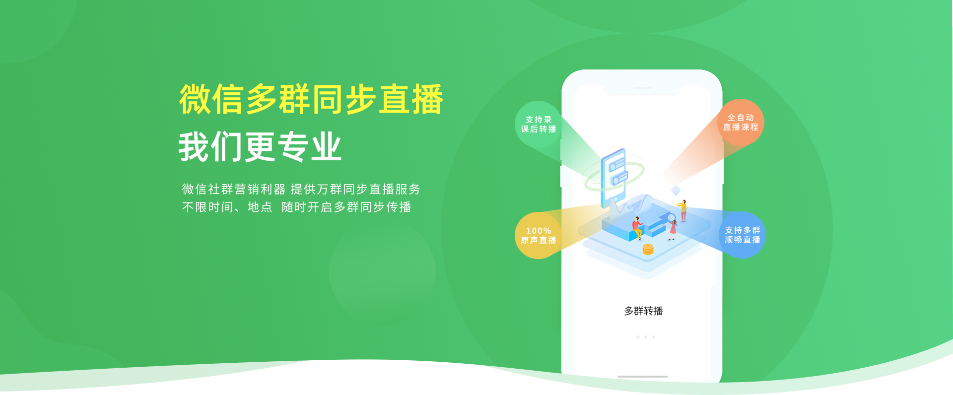 多群直播是针对教育培训、企业职场、电商微商、亲子母婴、其他需通过微信讲课传播内容的行业,专门定制的实时同步转播助手。